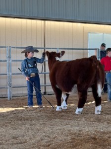 In January I went to the Elite Livestock Show Clinic with Cinnamon. We learned more about fitting and showing and I placed Reserve Showman and won the fitting contest with my brother Wyatt and Kiara. I kept working her hair and practicing and took her to the IV Classic Jackpot show and won Reserve Intermediate Showman on Day 1. We placed 2nd and 3rd in our classes. Lately I have been helping my dad build a new permanent cattle cover. I still work with Cinnamon and she has started even walking into position.