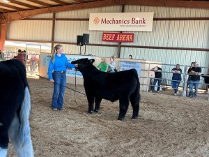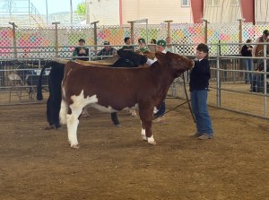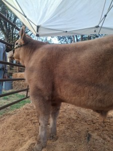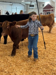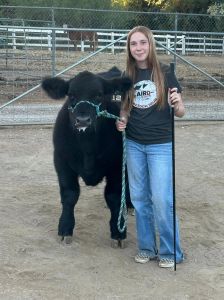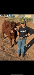 This month I got my steer and named him Bullet. I have been trying to work with him everyday, he is getting better at walking but he sometimes stops when I am walking him and he sometimes runs towards his pen when I’m walking him towards his pen. I’m trying to teach him to not get scared when he is around bigger cattle. He is fine with the show stick but he moves his feet a lot when you touch them with the show stick. He’s been eating really well and he’s getting used to his pen and home. He is starting to like me and he is getting used to me pulling him around. He has been getting better at not running towards his pen these past few weeks.