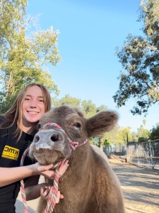 Hi for those who don’t know me my name is Kiara Konyn. In the past I have gotten to raise steers and a heifer though the Curren’s Cow Foundation. I got the privilege to take on Cash. I will be continuing to raise him for the Arizona National Show at the end of December. Even though I have not had him for long, we have gotten pretty close. We have been going on many walks around the dairy and he gets his hair worked with every day. He weighed 1020 lbs. this past weekend and is eating Purina Honors Show Chow Finishing Touch, Grass Hay, and a TMR blend. I loved working with this past month and can’t wait to see what the next month has in store for us. Today, the steer I bred for the San Diego County Fair, Squidward, moved in and became roommates with Cash. Thank again to Curren’s Cow Foundation, especially Pat Baker, for letting me work with and exhibit Cash.